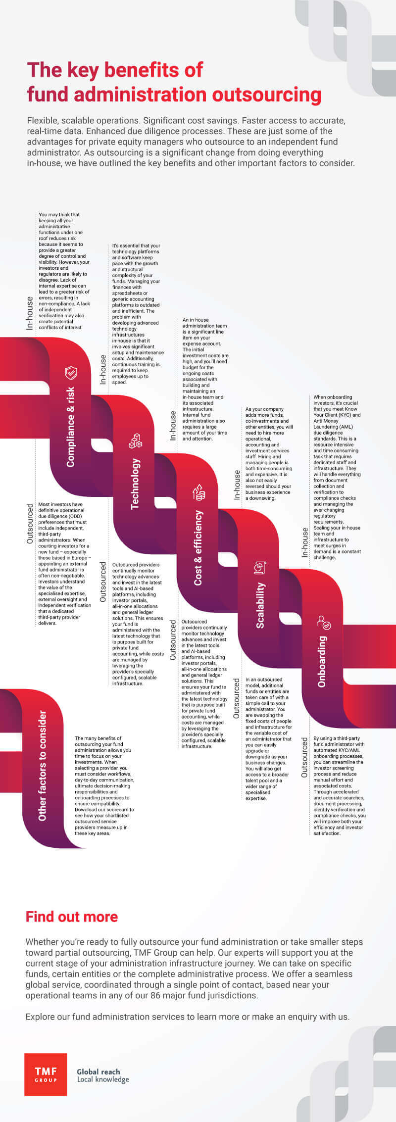 Flexible, scalable operations. Significant cost savings. Faster access to accurate, real-time data. Enhanced due diligence processes. These are just some of the advantages for private equity managers who outsource to an independent fund administrator. As outsourcing is a significant change from doing everything in-house, we have outlined the key benefits and other important factors to consider.