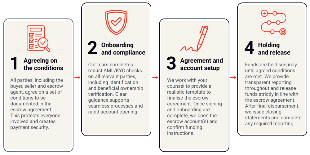 We work with your counsel to provide a realistic template to finalise the escrow agreement. Once signing and onboarding are complete, we open the escrow account(s) and confirm funding instructions.