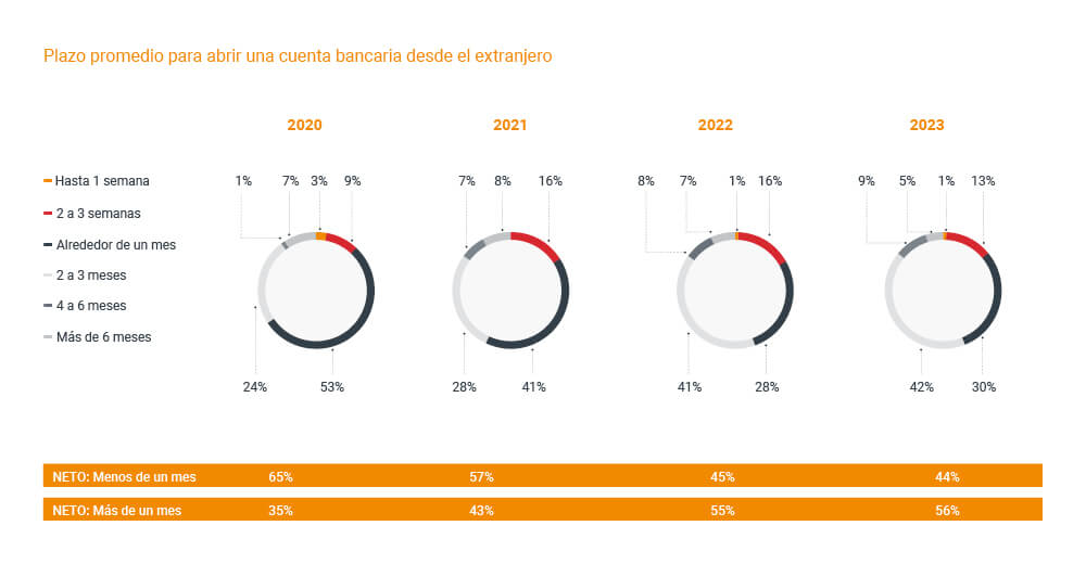 En los últimos años, el tiempo que se tarda en abrir una cuenta bancaria desde el extranjero ha aumentado en muchos lugares del mundo. En 2020, el tiempo promedio era inferior a un mes en el 65 % de las jurisdicciones, y solo el 44 % decía lo mismo en 2023.
